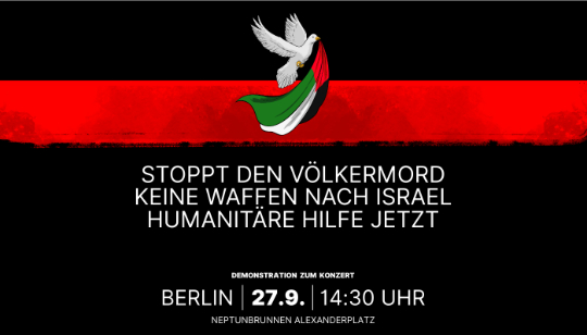 Kundgebung Samstag, 27. September 202517–21 UhrGroßer Stern, Straße des 17. Juni, Berlin Der AK Geschichte sozialer Bewegungen Ost-West und die Redaktion des BLOG Emanzipation und Geschichte unterstützen diese Demonstration und den folgenden Aufruf zur Demo: In Gaza werden nach wie vor ganze Familien durch Bomben ausgelöscht und tagtäglich wahllos Zivilist:innen umgebracht, unter ihnen viele Kinder. Hungernde Menschen suchen an den wenigen israelisch kontrollierten Ausgabestellen nach Hilfe und finden dort stattdessen den Tod. Unabhängige humanitäre Hilfe und Versorgung wird durch Israel blockiert und verhindert. Fast die gesamte Bevölkerung des Gazastreifens befindet sich auf der Flucht. Das Vorgehen der israelischen Regierung wird von Expert:innen und internationalen Organisationen seit Langem als Genozid beschrieben und vom Internationalen Gerichtshof als solcher untersucht. Während jede:r sehen [...]